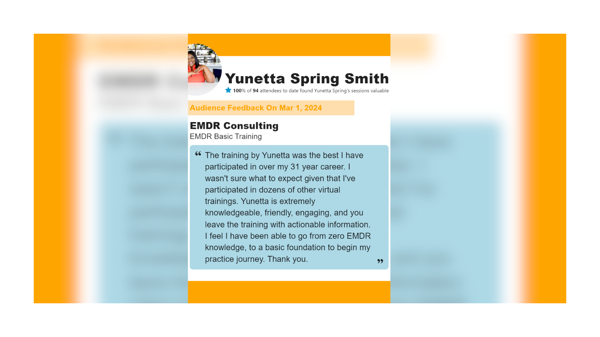 I've compiled a list of resources that have helped me during my EMDR career. Please feel free to refer to this list of resources at any time as this information will not disappear.